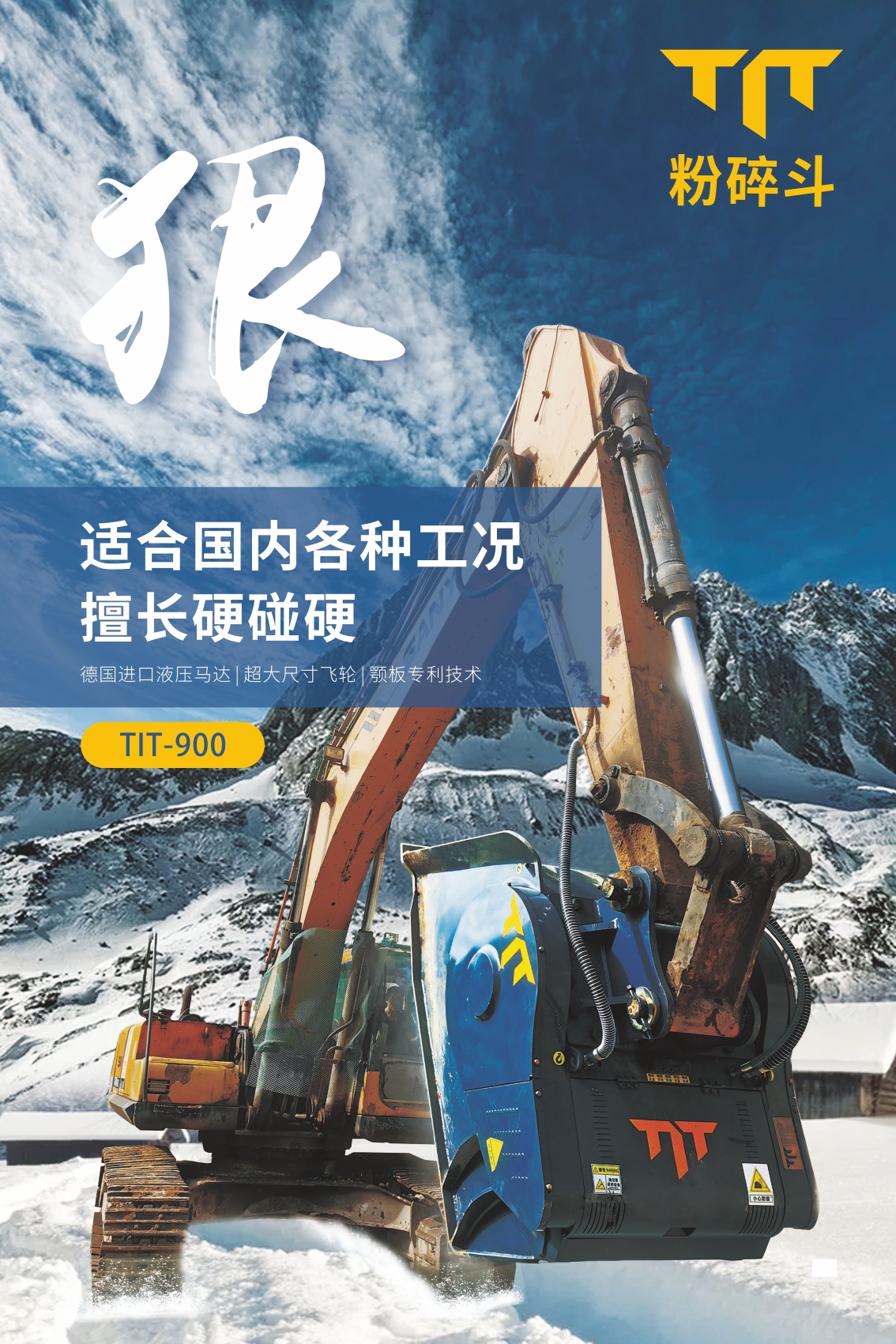 TIT,源自Titan的縮寫,原指古希臘神話中力大無窮的威猛之神,借意本產(chǎn)品剛勁有力,產(chǎn)能高效。TIT粉碎斗,也稱破碎斗,顎式破碎斗,是一款創(chuàng)新型挖掘機屬具,掛于挖掘機大臂上,可快速將工程惰性材料破碎成極具價值的工程用料。隨著國內(nèi)基建行業(yè)展,基于市場對經(jīng)濟化、效率化、環(huán)保化材料的大量需求,破碎斗將廣泛應(yīng)用于多種物料破碎場景。 |